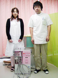 [ 柳医師(右)とペアを組む歯科衛生士。手前は訪問用の医療機器 ]