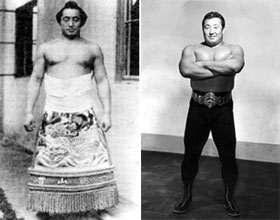 [ 左・大相撲力士時代の力道山、右・プロレスラーとして絶頂期の力道山 ]