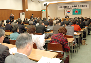 合同演説会制度が導入されたのは、2000年の第46回大会から。その時の参加者は、九州65人、中国・四国75人、近畿250人、中北200人。2003年の第47回大会は、九州85人、中国・四国86人、近畿198人、中北107人。今回は現在のところ、合同演説会が始まって以来の新記録となっている。なかでも近畿地協と中国・四国は当初予想を大きく上回り、前回、前々回のほぼ2倍となった。