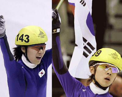 [ ショートトラック女子1500mで金メダルを獲得した陳善有(左)と男子1000mで2個目の金メダルを獲得した安賢洙(右) ]