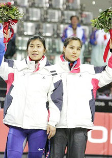 [ 女子ショートトラック1500㍍で金の陳善有(左)と銀の崔恩景 ]