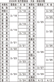 中央委員会と中央大会を終え、3月は全国各地の本部で地方委員会が開かれ、06年度の活動がスタートする。そのうち任期満了に伴う地方大会は、12日の鳥取県本部を皮切りに全国18地方で開催され、新しい3機関長が選出される。