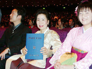 この卒業生は市内中区在住の在日2世、朴淑子さん(57)。朝鮮朝時代に高位の宮廷女官が身につけていたという金糸銀糸をまぶした特注の民族衣装「タンイ」をまとって山本通経済学部長から卒業証書と学業成績最優秀賞を受け取った。