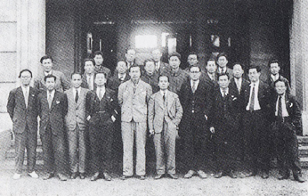 [ 建青中央本部の新幹部らが洪賢基委員長(前列左から6番目)と記念撮影(46年3月30日)