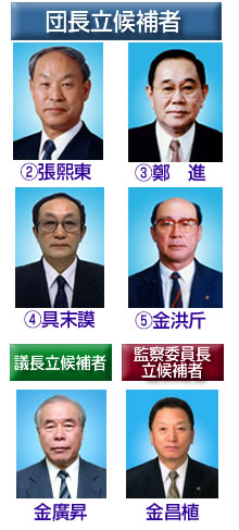 新団長に立候補したのは、登録順から洪采植(横浜商銀理事長)、張煕東(中央本部顧問)、鄭進(長野県本部常任顧問)、具末謨(東京新宿支部顧問)、金洪斤(中央本部顧問)の5氏だったが、洪候補が3日付で取り下げたため、4人で争われることになった。