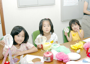 子どもたちはチャンスン(将軍標)の書かれた丸い紙に思い思いに色づけし、紙皿に貼り付けたり額にするなどの工作教室に夢中。遊びを通して高句麗からやって来たいにしえの渡来人に思いを馳せていた。