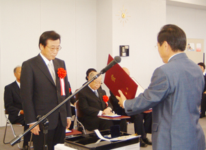 [ 石井岡山県知事から賞を贈られる金氏(左) ]
