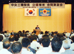 中央選挙管理委員会の辛容祥委員長は「民団の最高指導者は韓国の国是である自由と民主主義を守り、民団の規約を守ると同時に、創団60周年を迎えた民団組織の発展と在日同胞の権利拡大を図らなければならない。新指導者に立候補した各人の公約や能力、人間性を見極め、臨時大会には皆さんの清き一票を投じる権利行使を」と訴えた。続いて、4人の団長立候補者は、登録受付順で所信を表明した。