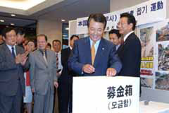 韓国中央会館の1階に設けられた義援金募金箱前では、民団中央本部の金宰淑団長や東京本部の許孟道団長はじめ韓商連、婦人会、青年会、体育会、軍人会の関係者が集まり、一人ひとりが被災者の安全を祈りながら誠金を出し合った。