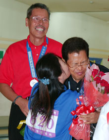 [ 女子ダブルスで金メダルを獲得した鄭花実(左)と朴祥子(右)組 ]