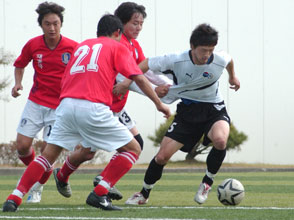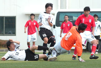 前半、開始早々の2分すぎ、いつもの早いパス回しで金太学が先制ゴール。その後、両チーム慎重な攻守が続き、無得点が続いたが、23分過ぎ、金一樹が執念の追加点。在日同胞はこれで勝利への流れをつかんだ。