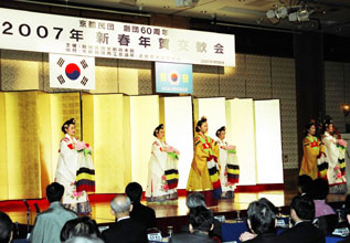 民団京都府本部が1947年1月10日に市内の京都新聞ホールで結成され、今年で60周年を迎えた。記念すべき60周年をさらなる飛躍につなげていこうと1月12日、京都全日空ホテルで「京都民団創団60周年 2007年新春年賀交歓会」を開いた。民団・婦人会の幹部をはじめ国会議員、府議会議員、市会議員、文化団体関係者ら総勢350人が一堂に集まり、韓日両国の発展とさらなる友好を誓い合った。