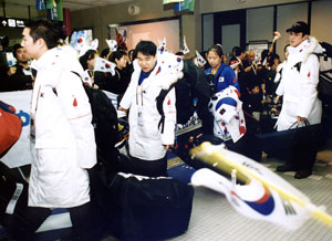 「韓国選手団イギョラ」と書かれた横断幕を掲げ、空港の到着ロビーで待ち受けた。婦人会のオモニたちは「少しでもリラックスしてもらえるように」とチマ・チョゴリ姿。到着ゲート横に勢ぞろいし、「オソオセヨ(ようこそ)」と声を揃えて出迎えた。
