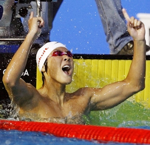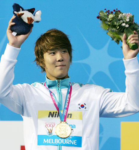 朴泰桓(パク・テファン・18=京畿高)が25日、オーストラリア・メルボルンで行われた第12回世界水泳選手権男子自由型400メートル決勝で1位となり、両手をあげて歓呼している。韓国選手の世界大会優勝は朴泰桓が初めて。朴泰桓は350メートルまで4位だったが、残り50メートルで一気に3選手を抜いた。