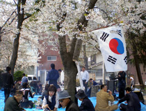 【大阪】昨年11月、民団大阪・生野東支部と同生野北支部が統合して誕生した生野中央支部(文煕元支団長)が8日、桜が見頃となった新今里公園で野遊会を開いた。