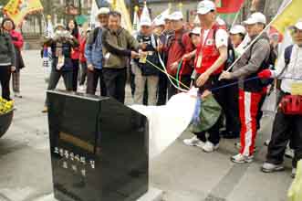 翌朝は5時に木魚で目を覚まされた。前日の黄砂は飛び散り、寒いがスッキリした天気。午後3時10分、歩行距離30㌔でゴールの龍仁大学入に到着。龍仁市役所前には「朝鮮通信使」のルート表示の石碑が建てられていた。