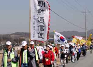 南大門の近くで、新たに建立された「朝鮮通信使の道」の碑が除幕された。漢江を渡ると黄砂がいっそう激しくなった。江南の市街地には早咲きの桜が咲いていた。食堂で「トンテチョンゴル(魚の辛味鍋)」の昼食。午後は畑が広がる旧道を進む。