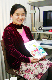 [ 手作りの「土曜学校」教材を手にする尹裕淑院長 ]