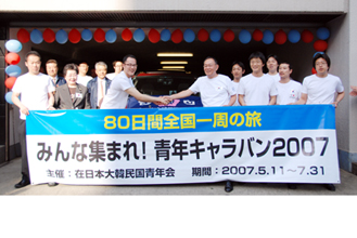 同胞青年のさらなる結集を期して、北海道から九州まで日本全国48地方本部を巡回する在日韓国青年会中央本部(康孔鮮会長)の「みんな集まれ!青年キャラバン2007〜80日間全国一周」が、11日の出発式を皮切りに開始された。キャラバン隊は、1000軒の同胞宅を訪問して1人でも多くの青年と意見を交換、9月に母国で実施の「07青年ジャンボリー」への参加を呼びかける。