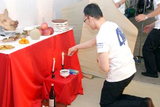 鄭団長と婦人会から、それぞれ金一封が贈られた。キャラバン隊の安全祈願のための「告 」では康青年会中央会長に続いて、鄭進団長、林三鎬青年会OB会会長も拝礼を行った。