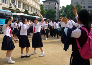 [ 梨大附属中生徒の見送りを受ける両国中学生(左)