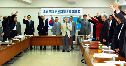 出発式参加者は、金秀吉東京本部副団長の先唱で「戸別訪問を完全実施しよう」とシュプレヒコールして、各区内全同胞世帯訪問を再確認した。