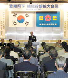 河政男事務総長は、「内外情勢と民団の当面する課題」と題した講演で、北韓の核開発など戦争挑発行為が総連系のみならず、民団同胞の経済活動や人権をも圧迫している事実をあげ、韓半島の平和確保と平和統一の推進は民団にとっても等閑視できない問題だと指摘。「問題点が整理された。民団が声を上げていくことが大切だ」などと語る参加者も多く、手応えのあるスタートとなった。 なお、愛知本部は研修に先立ち組織幹部拡大会議と「戸別訪問出発式」を開き、全世帯訪問を徹底するとともに、本部創立60周年事業を成功させることを確認した。