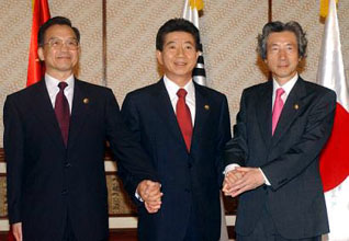 [ 03年10月、インドネシアでの韓日中首脳会談で握手する(右から)小泉純一郎首相(当時)、盧武鉉大統領、温家宝中国首相。日中いずれが中心でも角が立つ? 三国の微妙な関係を感じさせる写真だ。東北アジアの中心国家を目指す韓国の存在あってこそ…… ]