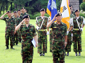 [ 第1特戦旅団司令部での入所式。入所者代表として司令官に敬礼する鄭進団長(最前列右) ]