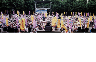 [ 「地方参政権の立法化を」と訴える民団の集会=2001年、東京・日比谷公園で ]