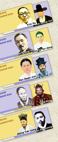 現在、韓国で使用されている紙幣の肖像人物は、朝鮮朝時代の儒学者、李退渓(本名は李滉、千ウォン札)、朱子学者で李滉とならぶ李栗谷(本名は李珥、5千ウォン札)、朝鮮朝4代目王、世宗大王(1万ウォン)となっている。