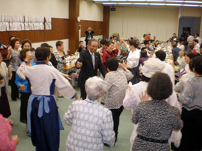 お年寄りたちは同支部が準備した韓国料理を味わい、「オモニコーラス」の歌や韓舞会(李貞順会長)による太鼓とチャンゴの演奏などを楽しんだ。チャンゴのリズムに合わせて思わず踊りだす姿も見られた。