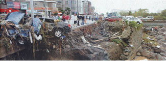 [ 台風による豪雨で崩れた済州市龍潭洞の道路 ]