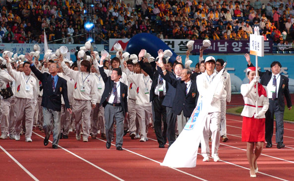 「夢とともに!前進とともに!栄光とともに!」をメインスローガンにし、カラフルな花火とともに始まった開会式で在日同胞選手団(金順英団長)は白と薄茶のユニホームで入場。