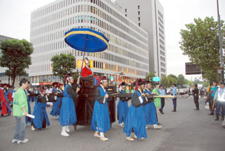「江戸天下祭」は多くの山車や神輿が繰り出して庶民を楽しませた江戸時代の祭り。江戸開府400年を記念して03年に復活した。今年は朝鮮通信使の初めての訪日から400周年を迎えることから、釜山の朝鮮通信使文化事業会(会長・許南植釜山市長)が千代田区に協力した。行列は吹奏楽隊を先頭に国書輿行列、正使行列、随行行列からなる総勢140人余り。皇居に通じる丸の内仲通りでは行列に加わったサムルノリの妙技がひときわ注目を集め、沿道からは雄叫びにも似た歓声とともに大きな感動の拍手が巻き起こった。