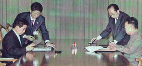 [ 「南北関係発展・平和繁栄宣言」に署名する盧武鉉大統領(左)と金正日国防委員長 ]