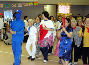 【大阪】大阪市生野区と平野区の介護事業所、NPO在日コリアン高齢者支援センターサンボラム(李成俊理事長)を利用するお年寄りたちが8日、生野区民センターで運動会を楽しんだ。両事業所からお年寄り59人が「第4回サンボラム杯」をめざし、赤・青2チームに分かれて争った。