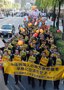 大会終了後、都内で開かれた民団権益擁護委員会、婦人会中央本部役員と賛同市民団体代表らとの会合では、日本政府と韓国政府にアピールするあらゆる活動を展開することで一致した。具体的には各政党へのロビー活動をはじめ、世論喚起のためのシンポジウムを実行委員会形式で全国展開する。そこには地方議員も呼び、各党本部への波及効果を狙っていく。この方式はさる3日、民団鳥取本部と市民団体が実行委を構成し、300人規模の「第1回永住外国人地方参政権シンポジウムin鳥取」をサンプルにした。