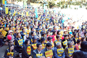 当日の会場は、9人がけの座席を12人が分け合い、それでも足らずに通路が埋まり、座席スペース後方の立見席もほぼ埋まった。遠方からの参加者も長旅の疲れを見せなかった。主催者あいさつや来賓の激励辞では、視線を演壇にまっすぐ向け、ここぞというタイミングでは必ず一斉に拍手と声援をおくった。見事な集中力であった。