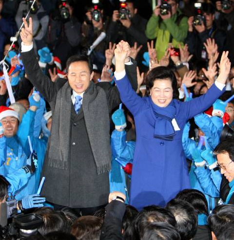 [ 当選後、汝矣島のハンナラ党本部前で支持者たちの歓呼に手を振ってこたえる李明博夫妻 ]