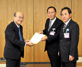 [ 泉信也国家公安委員長に陳情書を伝達する鄭進中央団長(中央)と崔鐘太会長 ]