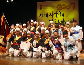 忠清南道の公州で開催されたサムルノリ世界競技大会で、建国チームが創作部門で在日初の大統領賞(1位)を受賞した=11月11日
