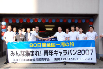 同胞青年のさらなる結集を期して、青年会中央本部は中央会館で「青年会キャラバン全国一周」の出発式を持った=5月11日。80日間で1000戸を訪問