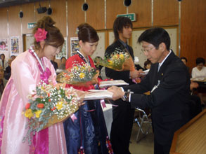 金団長は「韓日文化・経済交流の懸け橋としての役割を担ってください」と激励。新成人を代表して権梨奈さん(同志社大2年)が「私たちが先頭に立って韓日両国をつなぎ、在日同胞社会並びに日本社会に一層の貢献を果たしたい」と韓国語で力強く語った。