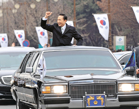 [ 就任式典後、ソウル市内をパレードし、国民たちの歓呼に応える李明博大統領 ]