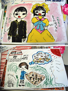 家族との別れを惜しむ「廣井のおじいちゃん(全泰機さん)」の絵。日本に向かう船の絵も描かれている。泰機さんの目には涙が。一方、二人の結婚式の絵はほほえましいできあがり。絵には「わたくしたちのおじいちゃん」「わたくしたちのおばあちゃん」の文字が見える。