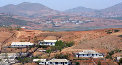 [ 北韓の山は段々畑政策に、薪を得るための乱伐が加わり多くがはげ山となっている。写真は南浦近郊 ]