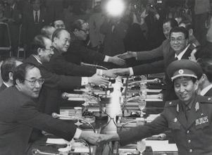 [ 1991年9月5日に開かれた初の首相会談で握手をする韓国側(左)と北朝鮮側代表団祖国 ]