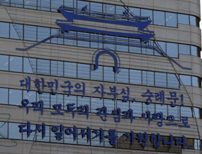 [ 南大門に近い親韓銀行本店ビルのイルミネーション「大韓民国の自負心 崇礼門! われわれは皆の関心と愛で再び立ち上がることを祈願する」 ]