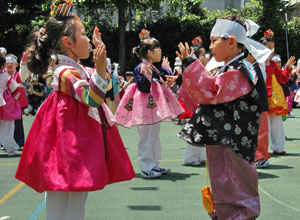 東京韓国学校で1日、初等部の第55回大運動会が行われた。人気を集めたのは1年生がペアで演じた「コットゥガクシ(操り人形)」。この日が入学後、初めて民族舞踊を披露する場となった。その表情は恥ずかしそうでいて、ちょっぴり誇らしげ。そんなわが子の晴れ姿をビデオカメラを手にした父母が熱心に追いかけた。チマチョゴリ、パジチョゴリは各自が家庭から持ち寄った。丈の長いチマはオモニたちが集まって短く裁縫しなおしたという。